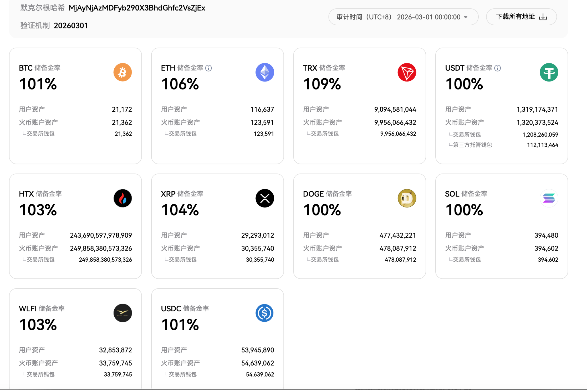TechFlow News: On March 9, according to the latest Merkle Tree Proof of Reserves (PoR) data released by HTX, as of March 1, 2026 (UTC+8), HTX maintains full—or even over—reserves across all assets. Core asset reserve ratios all exceed 100%, and overall asset transparency and security remain stable.