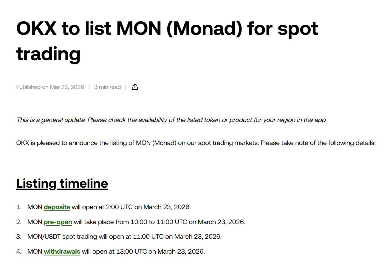 According to the official announcement, OKX will list MON (Monad) spot trading.
