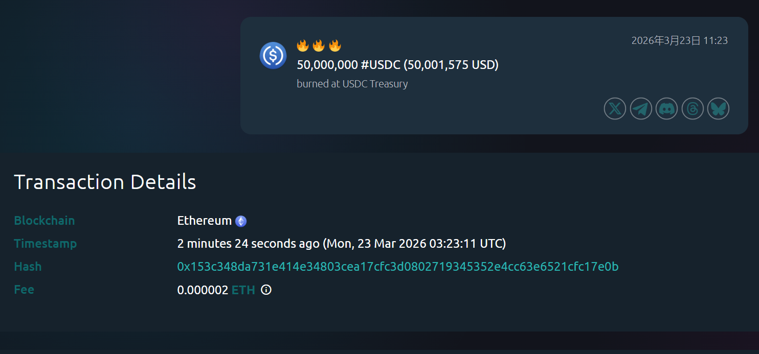 TechFlow News: On March 23, according to on-chain data analytics platform Whale Alert, the USDC Treasury executed a burn transaction on the Ethereum blockchain, destroying a total of 50,000,000 USDC.