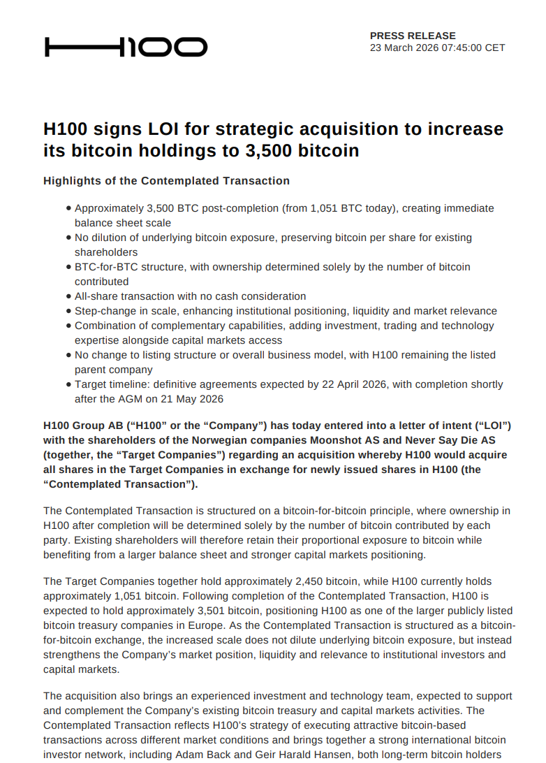 TechFlow News: On March 23, according to an official announcement, H100 Group AB, a Swedish-listed Bitcoin treasury company, has signed a strategic acquisition letter of intent with the shareholders of Norwegian companies Moonshot AS and Never Say Die AS. Upon completion of the transaction, H100’s Bitcoin holdings are expected to increase from the current 1,051 BTC to approximately 3,501 BTC.