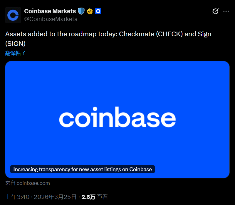 TechFlow News, March 25: According to an official announcement, Coinbase announced early this morning that it has added Checkmate (CHECK) and Sign (SIGN) to its listing roadmap. Trading for these assets remains contingent upon market-making support and the readiness of technical infrastructure; the specific listing dates will be announced separately once all relevant conditions are met. Additionally, Coinbase announced it will list Perle (PRL).