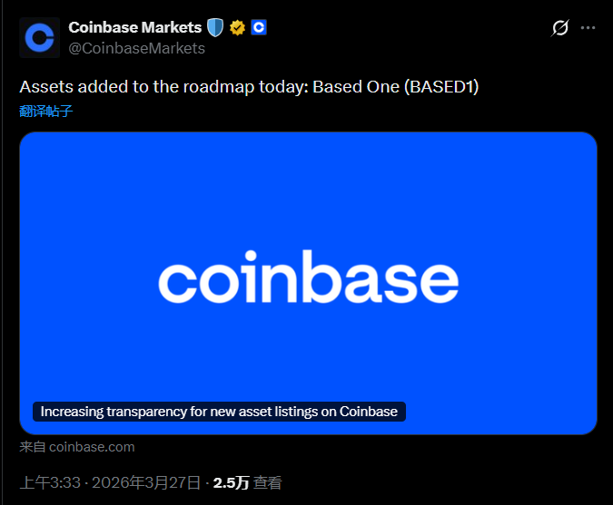 According to the official announcement, Coinbase announced early this morning that Based One (BASED1) has been added to its listing roadmap.