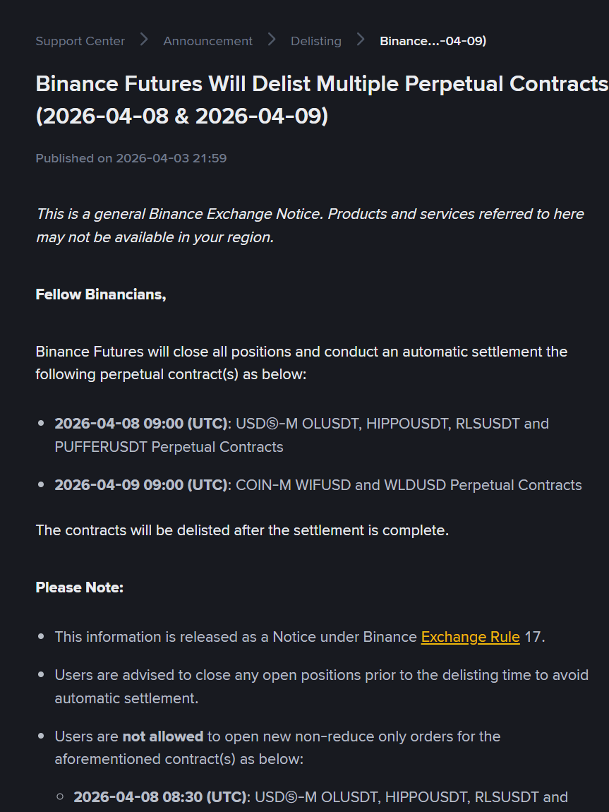 April 8, 2026, at 09:00 UTC: USDⓈ-M OLUSDT, HIPPOUSDT, RLSUSDT, and PUFFERUSDT perpetual contracts;