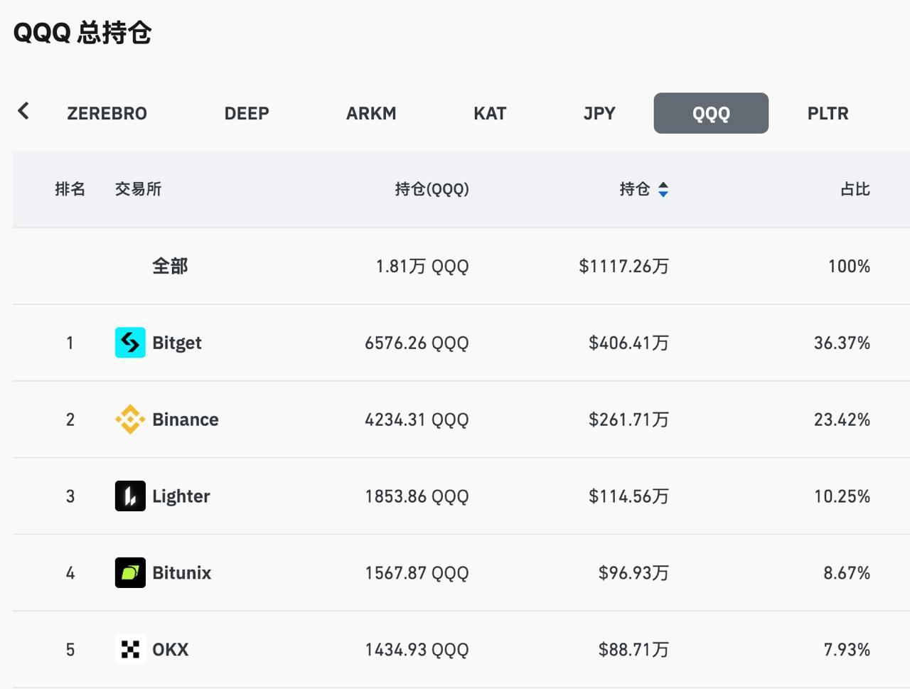 TechFlow News, April 14: According to CoinGlass data, the total open interest of Nasdaq-100 Index ETF (QQQ) perpetual futures across all exchanges reached $11.1726 million. The top five exchanges by open interest are Bitget (36.37%), Binance (23.42%), Lighter (10.25%), Bitunix (8.67%), and OKX (7.93%).