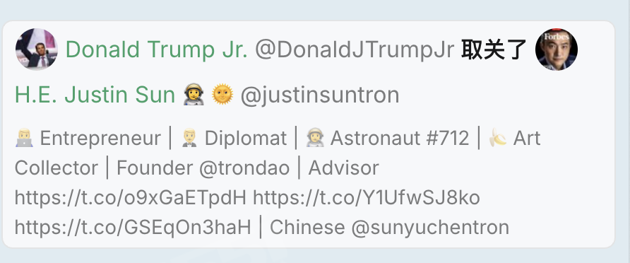 TechFlow News: On April 24, monitoring platform data showed that Donald J. Trump Jr. (@DonaldJTrumpJr) and Zak Folkman (@zakfolkman), co-founder of World Liberty Fi, unfollowed Sun Yuchen (@sunyuchentron) in succession.