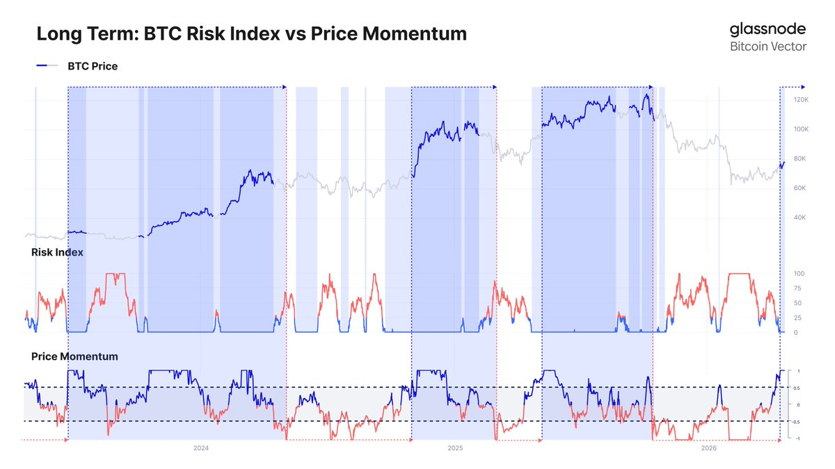 TechFlow reports that on April 24, Glassnode stated Bitcoin is currently exhibiting a bullish signal, with its Vector framework having triggered a clear signal. Specifically, the momentum indicator is considered bullish when above 0.5 and bearish when below -0.5; its current value stands at 1. Meanwhile, the risk index has fully reset to 0. Glassnode noted that, as indicated by the blue shaded area on the chart, historically, this signal has corresponded with significant price rallies and provided a reference for avoiding downside risk during market downturns.