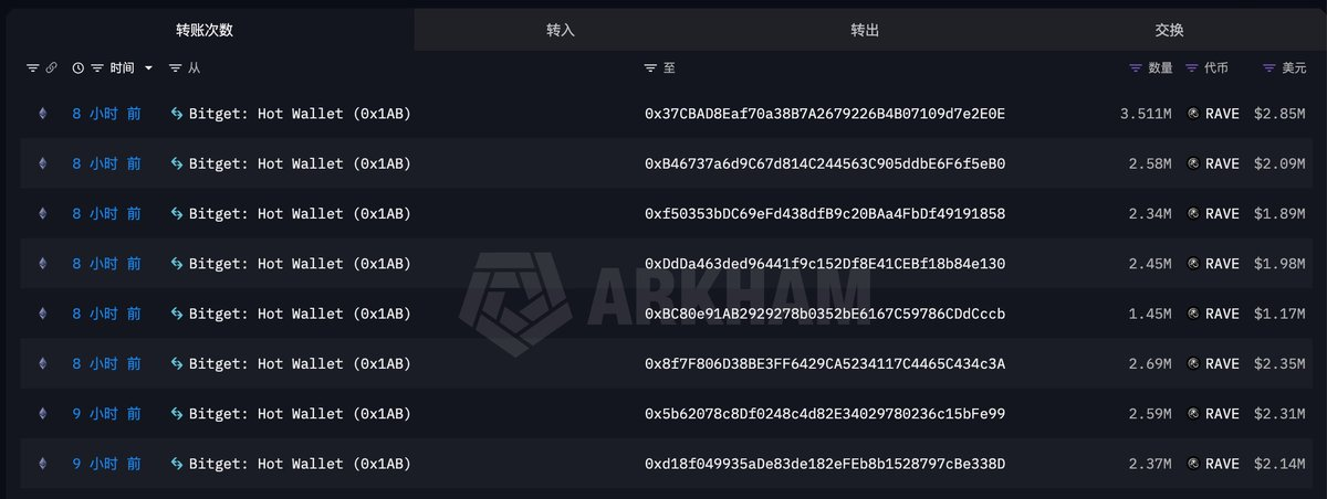 TechFlow News: On April 26, according to on-chain analyst Yujin’s monitoring, 20 million RAVE tokens (approximately $16.78 million) were withdrawn by the RAVE market maker from Bitget to eight on-chain wallets eight hours ago.