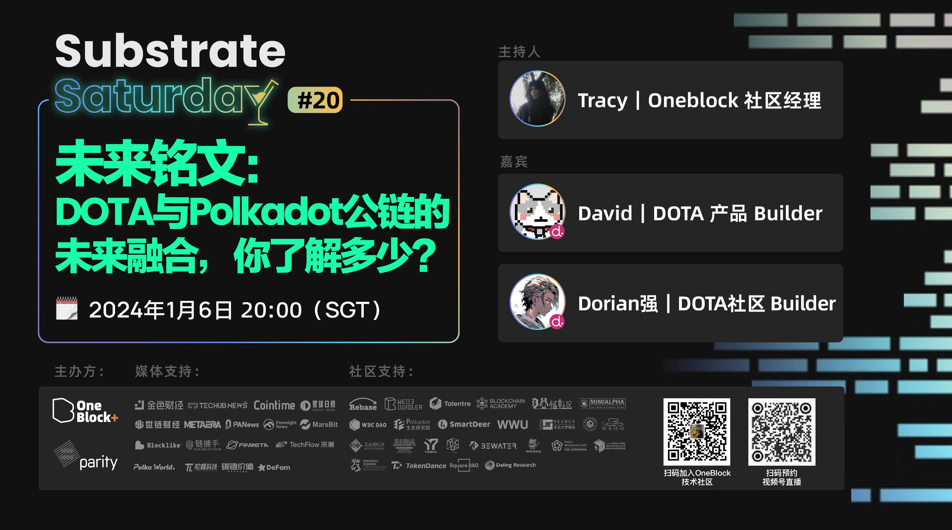 参与Substrate Saturday,深入了解dota协议与DOTA铭文的创新背后的故事。从技术合作到跨链规则,聆听Polkadot公链与DOTA的融合之美。