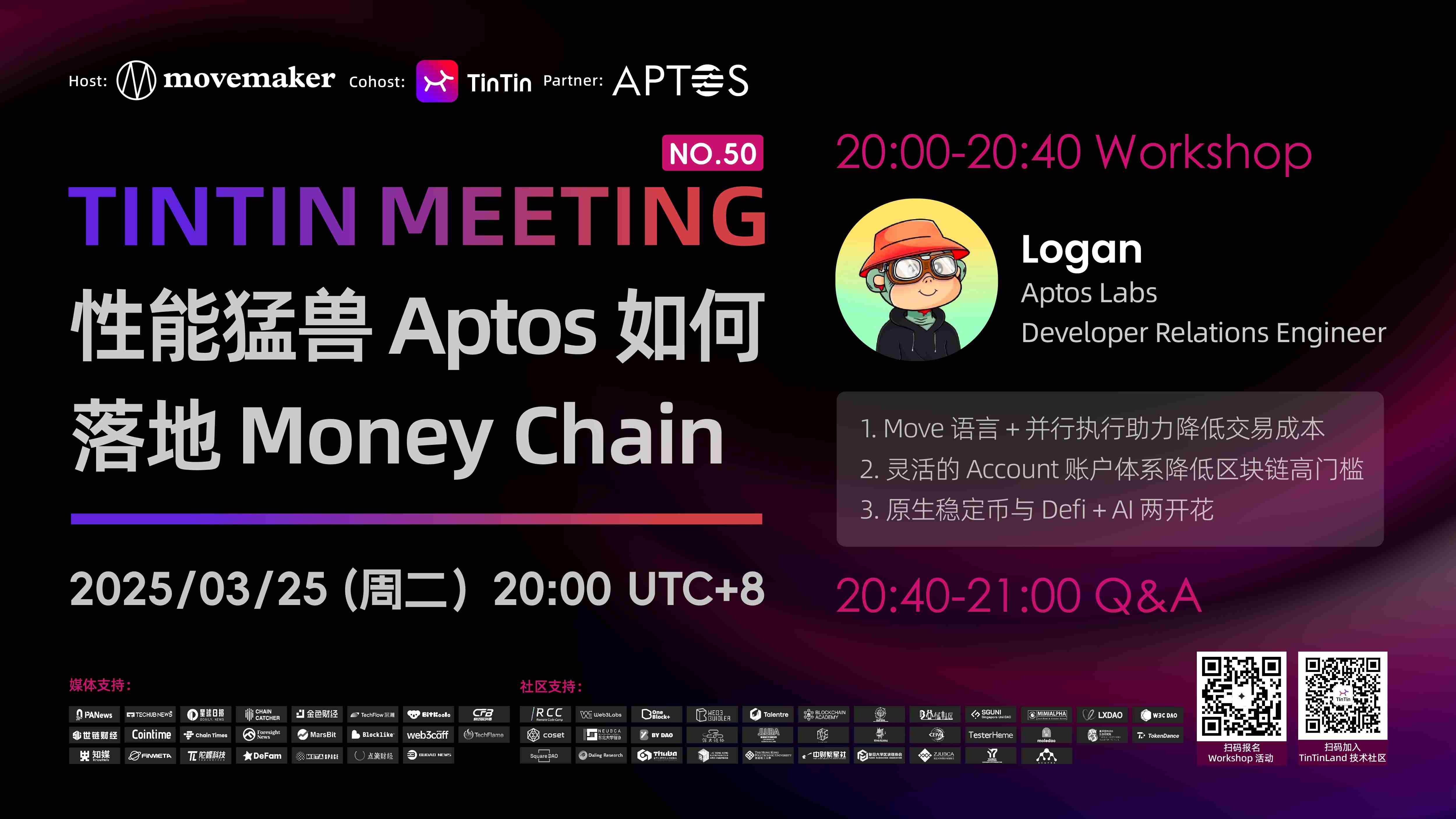 🔥 本周二晚 20:00 (UTC+8), TinTinMeeting 邀请 Aptos Labs 开发者关系工程师 Logan,带你深入剖析 Aptos 生态开发的创新路径,揭秘 Move 语言的高能应用!