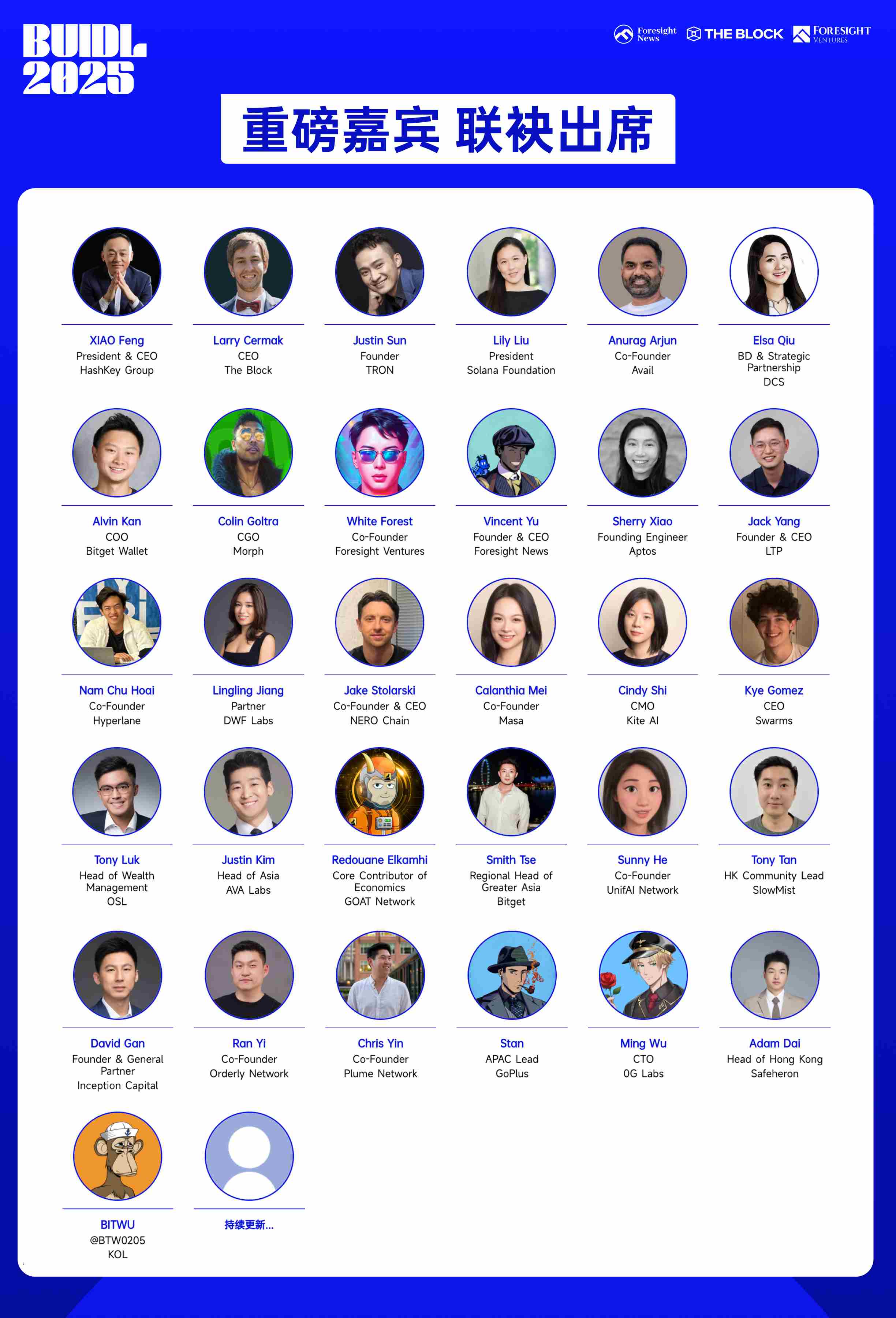 「BUIDL 2025」是由 Foresight News 和 The Block 共同主办的一场精彩纷呈的全球加密货币盛会,旨在利用东西方强大的媒体影响力,为全球加密领域的开拓者们搭建一座促进合作与交流的动态桥梁。此次活动汇聚了行业巨头、不同领域的独角兽企业、顶级风险投资机构和知名意见领袖——将最优秀的头脑聚集在一起,激发创意火花,释放卓越构想,推动加密领域的创新与突破。