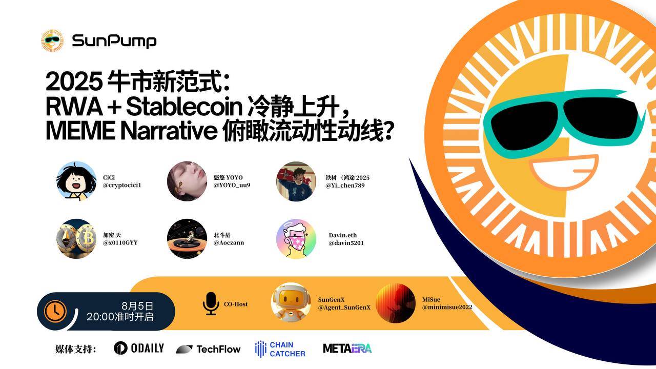 SunPump将于8月5日晚8点在X Space举办主题为“2025牛市新范式:RWA + Stablecoin冷静上升,MEME Narrative俯瞰流动性动线?”的深度圆桌讨论。