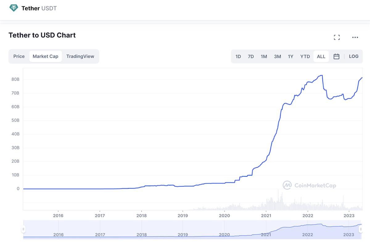 简而言之,相关数据显示稳定币的使用呈指数级增长。自 2021 年以来,稳定币的市值呈急剧上升趋势,其在全球经济中的重要性也不断加强。以下是自 2016 年以来 USDT 及其他币种的市值图表: