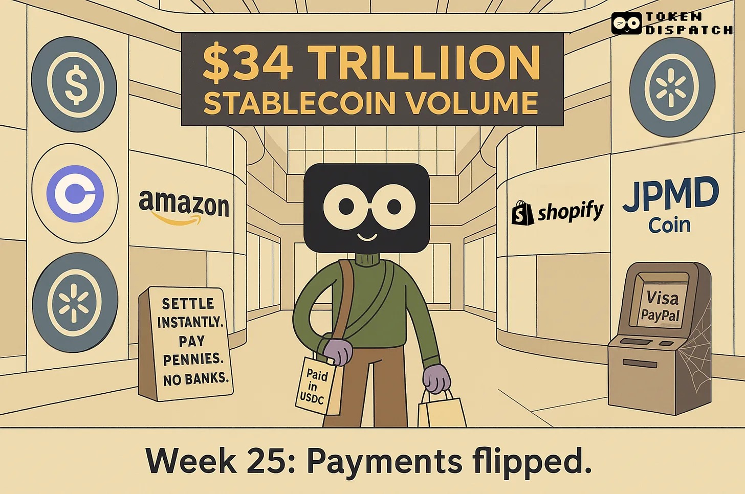 真正的变化隐藏在显而易见之处。Stripe 刚刚收购了一家加密钱包公司,Shopify 将稳定币支付设为默认选项,据报道,亚马逊和沃尔玛也在打造自己的稳定币。