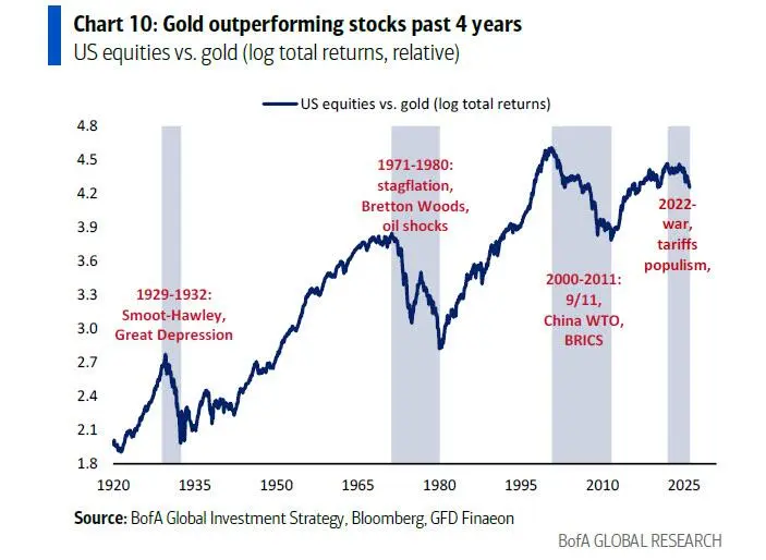 Sous réserve que le yen ne s'effondre pas à court terme, Hartnett juge que les marchés entrent dans une phase de « Nouvel ordre mondial = Nouveau marché haussier mondial ». Trump poursuit et amplifie l'expansion budgétaire initiée par Biden. Dans ce contexte, Hartnett recommande d'augmenter les positions sur les actions internationales, alors même que l'excès de positionnement en faveur de l'exceptionnalisme américain commence à s'inverser vers un rééquilibrage mondial. Les données montrent qu'entre 2020 et aujourd'hui, les fonds actions américains ont attiré 1 600 milliards de dollars, contre seulement 400 milliards pour les fonds mondiaux — un déséquilibre qui devrait désormais se corriger. La Chine est le marché préféré de Hartnett. Selon lui, la fin de la déflation chinoise pourrait devenir le catalyseur d'un marché haussier au Japon et en Europe. Du point de vue géopolitique, le fait que la Bourse de Téhéran ait grimpé de 65 % depuis août dernier, tandis que les marchés saoudiens et dubaïotes restent stables, indique que la région ne connaît pas de risque révolutionnaire. C'est une bonne nouvelle pour les marchés, étant donné que l'Iran représente 5 % de l'offre pétrolière mondiale et 12 % des réserves prouvées.02 Le marché haussier de l'or est loin d'être terminé