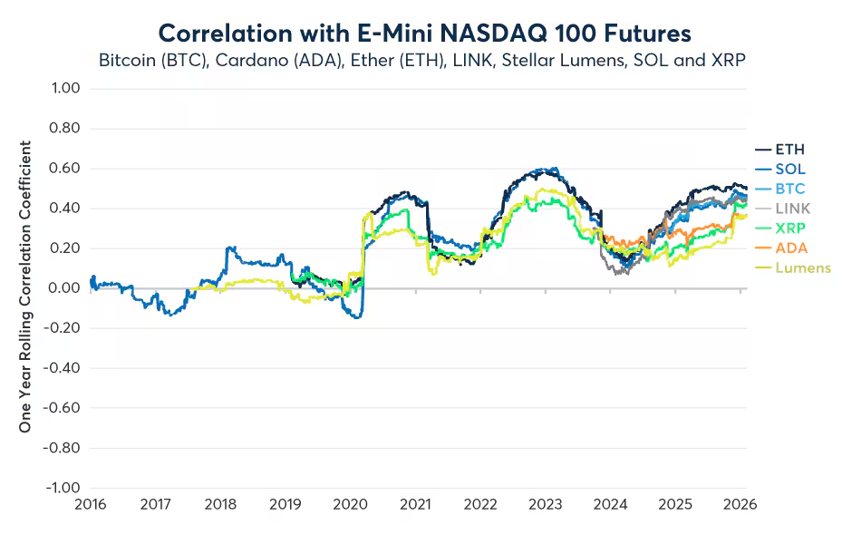 Des recherches du groupe CME montrent que, depuis 2020, la corrélation entre les actifs cryptés et l’indice Nasdaq 100 reste globalement positive. En outre, durant certaines périodes début 2025 et 2026, la corrélation glissante a atteint environ +0,35 à +0,6 (elle est donc clairement cyclique, non constante).