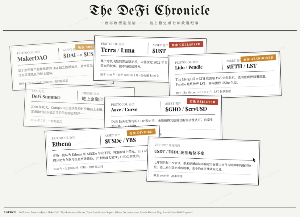 - En 2025, le marché avait brièvement cru que l’$USDe d’Ethena était différent, capable de redonner éclat à la finance sur chaîne ; mais les stablecoins rémunérés se sont finalement scindés entre dépôts classiques et activités génératrices de rendement, sans toutefois contester la domination de l’USDT et de l’USDC dans leurs domaines respectifs.