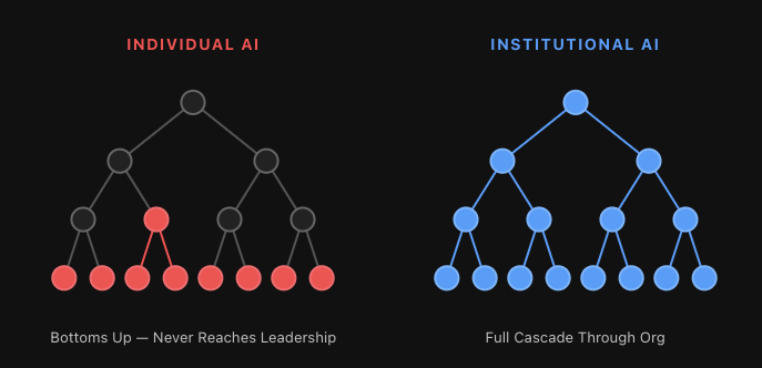 Cela n’est pas hypothétique. Chaque organisation qui adopte l’IA sans couche de coordination connaît actuellement ce phénomène. Chaque employé développe ses propres habitudes d’utilisation de ChatGPT, son propre style de prompts, ses propres sorties — totalement déconnectées de celles des autres. L’organigramme peut encore figurer sur papier, mais le travail généré par l’IA suit en réalité un tout autre parcours.