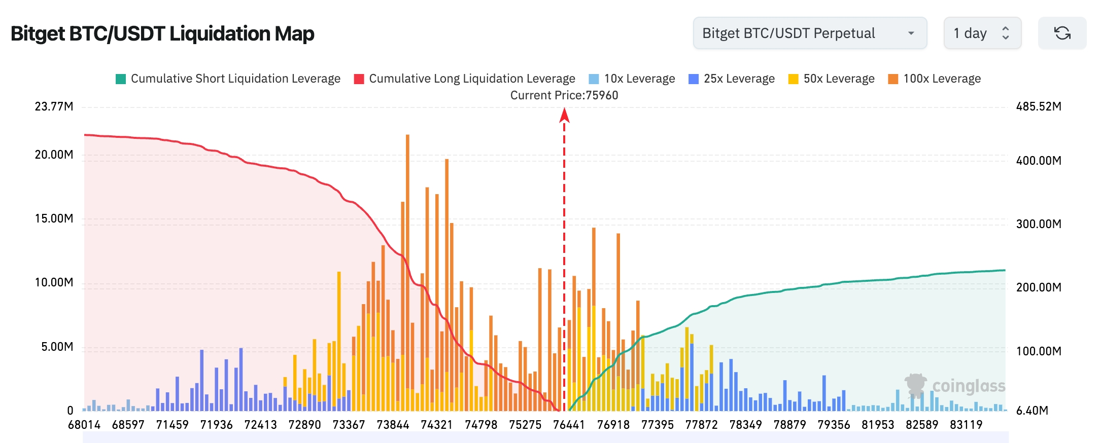 - Carte des liquidations BTC/USDT sur Bitget : densité élevée de liquidations de positions vendeuses entre 76 000 et 78 000 USD ; le cours s’en rapproche, et une percée au-delà de ce seuil pourrait déclencher une vague de rachats forcés (« short squeeze »). En revanche, les positions acheteuses (long) ont quasiment toutes été liquidées sans réintégration notable ; une baisse à court terme manquerait donc de catalyseur liquide, et la structure reste globalement haussière.