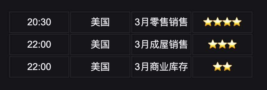 - Publication des ventes au détail américaines pour mars : observation de la résilience de la consommation et de son impact sur l’évaluation économique et monétaire.