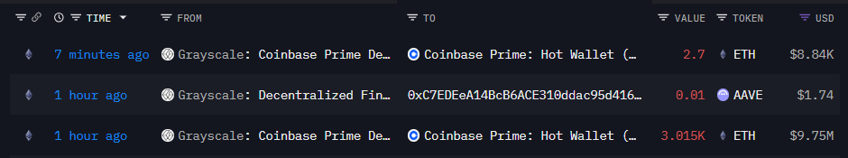 Selon les données de surveillance d'Arkham, il y a environ une heure, Grayscale a transféré 3 015 ETH vers l'adresse du portefeuille chaud de Coinbase Prime, d'une valeur d'environ 9,75 millions de dollars.
