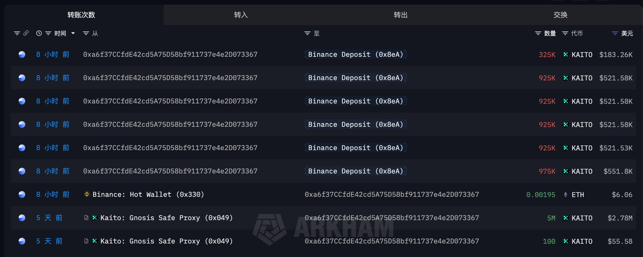 TechFlow, le 9 janvier, selon le suivi de l'analyste blockchain Yu Jin (@EmberCN), il y a 5 jours, l'adresse multisignature du contrat Kaito a transféré un total de 24 millions de $KAITO (environ 13,31 millions de dollars) à 5 adresses. Une des adresses ayant reçu 5 millions de KAITO a transféré l'intégralité des jetons (d'une valeur d'environ 2,82 millions de dollars) vers l'exchange Binance il y a 8 heures.