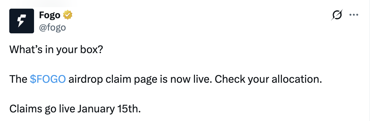 TechFlow, 14 janvier : le projet blockchain Fogo, basé sur SVM L1, a annoncé que la page de vérification des airdrops est désormais en ligne. Les demandes seront officiellement ouvertes à partir du 15 janvier.