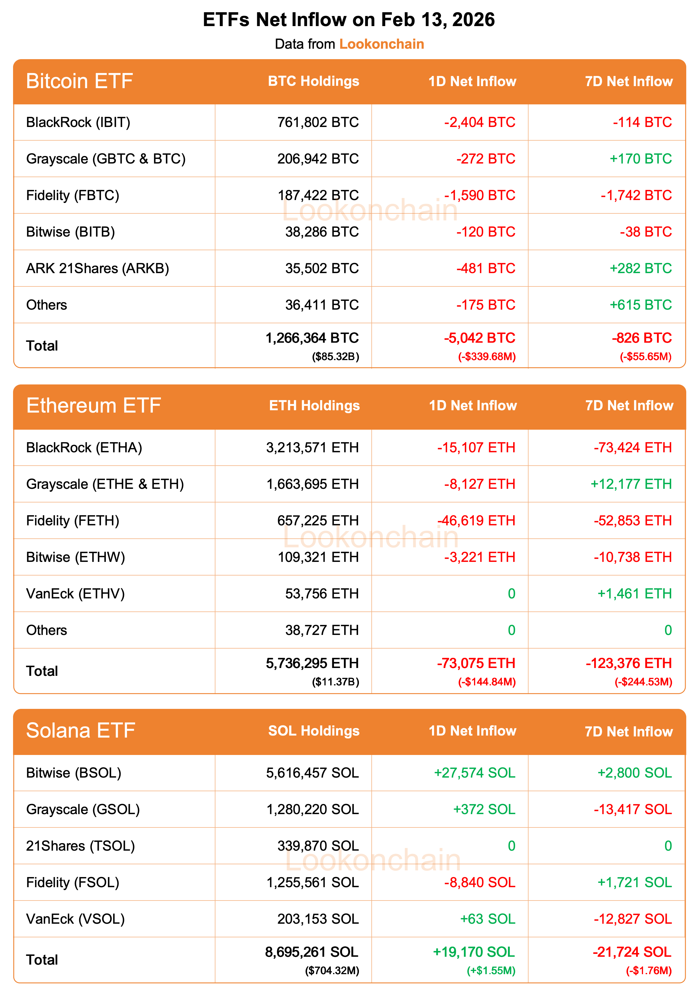TechFlow – Selon les données de Lookonchain, au 13 février, les ETF Bitcoin ont enregistré un flux net sortant de 5 042 BTC (soit 339,68 millions de dollars américains) à la date de publication ; les ETF Ethereum, un flux net sortant de 73 075 ETH (soit 144,84 millions de dollars américains) ; et les ETF Solana, un flux net entrant de 19 170 SOL (soit 1,55 million de dollars américains).