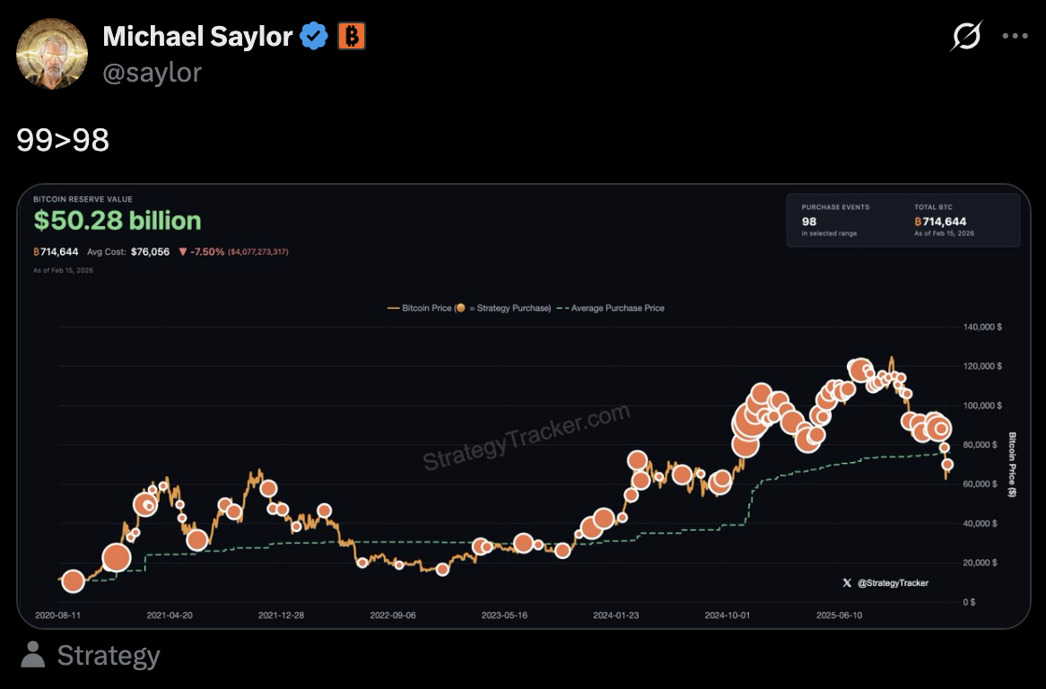 TechFlow rapporte que le 15 février, Michael Saylor, fondateur de Strategy, a publié à nouveau sur la plateforme X des informations relatives à son suivi du bitcoin ; les données concernant d’éventuels achats supplémentaires pourraient être dévoilées la semaine prochaine.