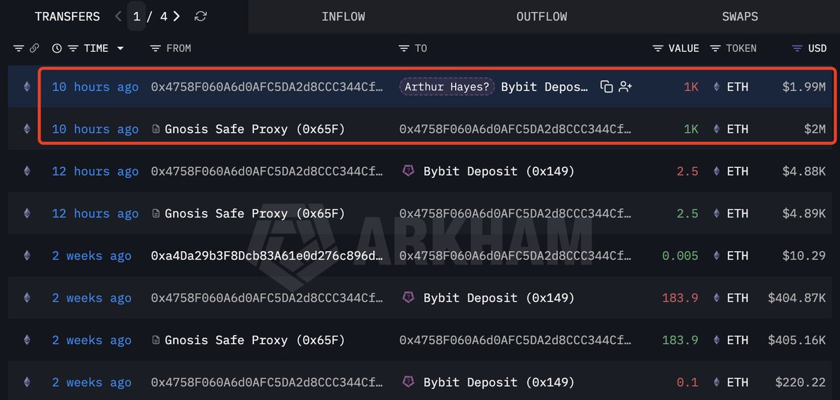 Selon la surveillance de Lookonchain, Arthur Hayes a déposé 1 000 ETH (environ 1,99 million de dollars américains) sur Bybit il y a 10 heures.