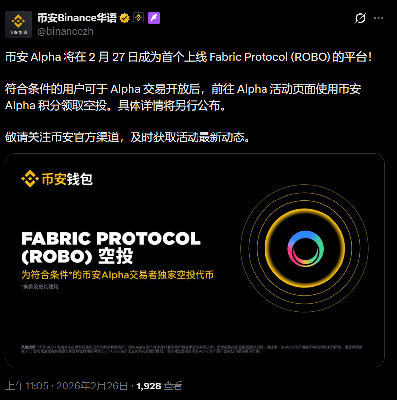 TechFlow annonce que, le 26 février, selon un communiqué officiel, Binance Alpha deviendra la première plateforme à lister le protocole Fabric (ROBO), à compter du 27 février.