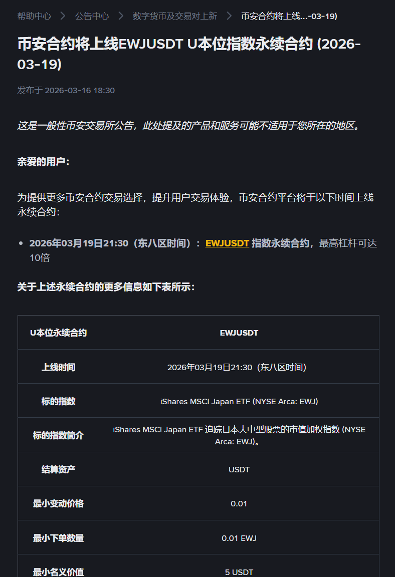 - 19 mars 2026 à 21h30 (heure de Pékin) : contrat perpétuel indexé EWJUSDT, avec un effet de levier maximal de 10×