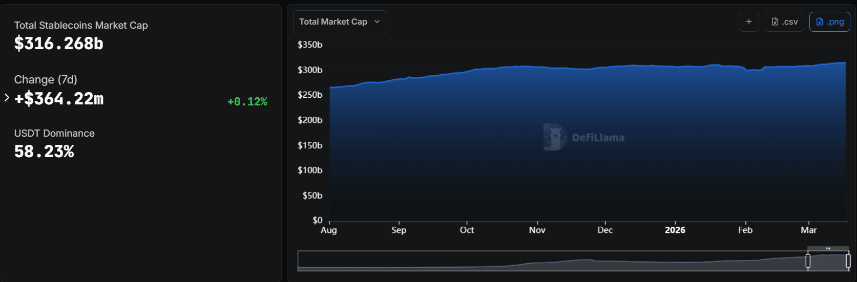 TechFlow – Selon les données de DeFiLlama, au 23 mars, la capitalisation boursière totale des stablecoins sur le marché cryptographique s’élève à 316,268 milliards de dollars américains, soit une augmentation de 364,22 millions de dollars par rapport à la semaine précédente, soit une croissance hebdomadaire de 0,12 %. Le stablecoin USDT représente à lui seul 58,23 % de cette capitalisation boursière totale.