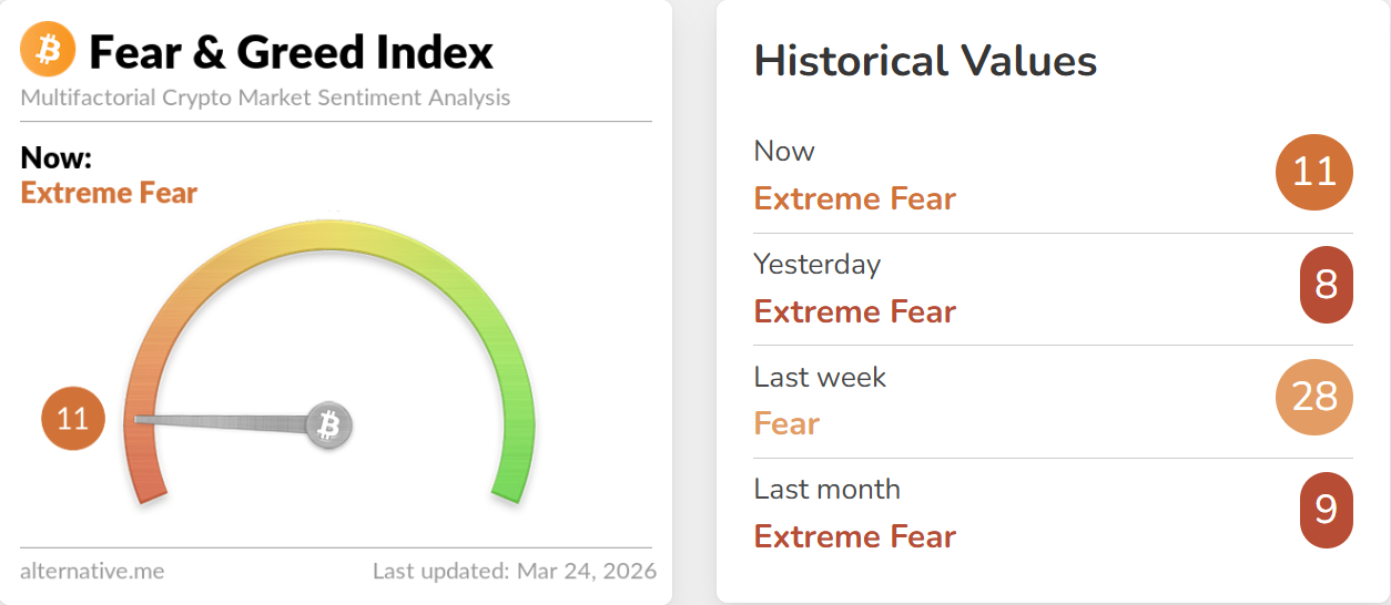 TechFlow – Selon les données d’Alternative.me, le 24 mars, l’indice de peur et de cupidité des cryptomonnaies a grimpé à 11 (contre 8 la veille), indiquant que le marché reste dans un « état de peur extrême ».