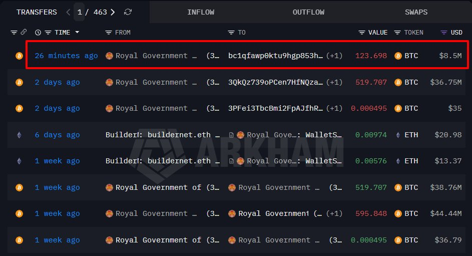 Selon le suivi d’Onchain Lens, le gouvernement du Royaume du Bhoutan a de nouveau transféré 123,7 BTC vers une nouvelle adresse, pour une valeur d’environ 8,5 millions de dollars américains.