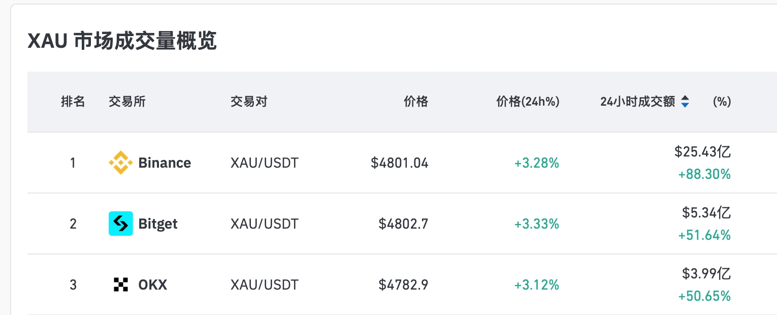 TechFlow informe, le 8 avril : Selon les données de CoinGlass, le cours actuel de XAU s’élève à 4 800,47 USD, en hausse de 3,29 % sur 24 heures. Sous l’effet de cette volatilité du marché, le volume des contrats XAU sur l’ensemble du réseau a atteint 4,409 milliards de dollars américains sur 24 heures, soit une augmentation de 66,87 % par rapport à la période précédente. Sur les plateformes d’échange centralisées, la liquidité est principalement concentrée sur Binance, Bitget et OKX, dont les volumes de transactions sur 24 heures s’élèvent respectivement à 2,543 milliards de dollars, 534 millions de dollars et 399 millions de dollars, plaçant ces trois plateformes aux trois premières positions.