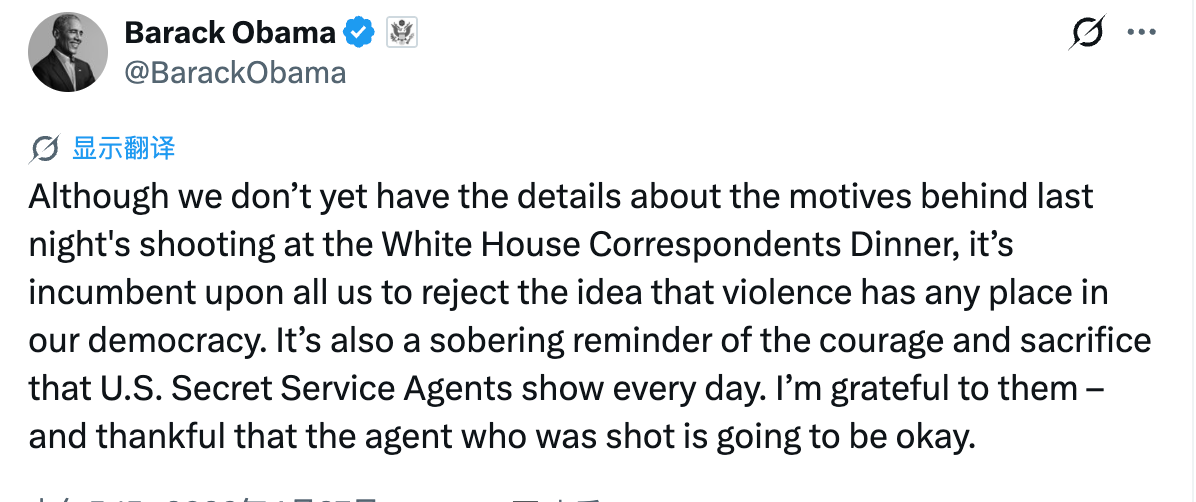 TechFlow rapporte que, le 27 avril, l’ancien président américain Barack Obama a publié ce matin un message en réaction à la fusillade survenue lors du dîner annuel des correspondants de la Maison-Blanche. Bien qu’il ne connaisse pas encore les détails concernant la motivation derrière cet acte, il a déclaré : « Nous devons tous rejeter catégoriquement l’idée selon laquelle la violence aurait une quelconque place dans notre démocratie. Cet événement constitue également un rappel poignant du courage et des sacrifices quotidiens des agents du Service secret américain. »