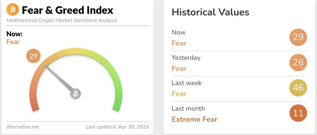 TechFlow – Selon les données d’Alternative.me, l’indice de peur et de cupidité des cryptomonnaies a atteint 29 aujourd’hui, 30 avril (contre 26 hier, soit un niveau « de peur »), indiquant que le marché se trouve toujours dans un état de « peur ».
