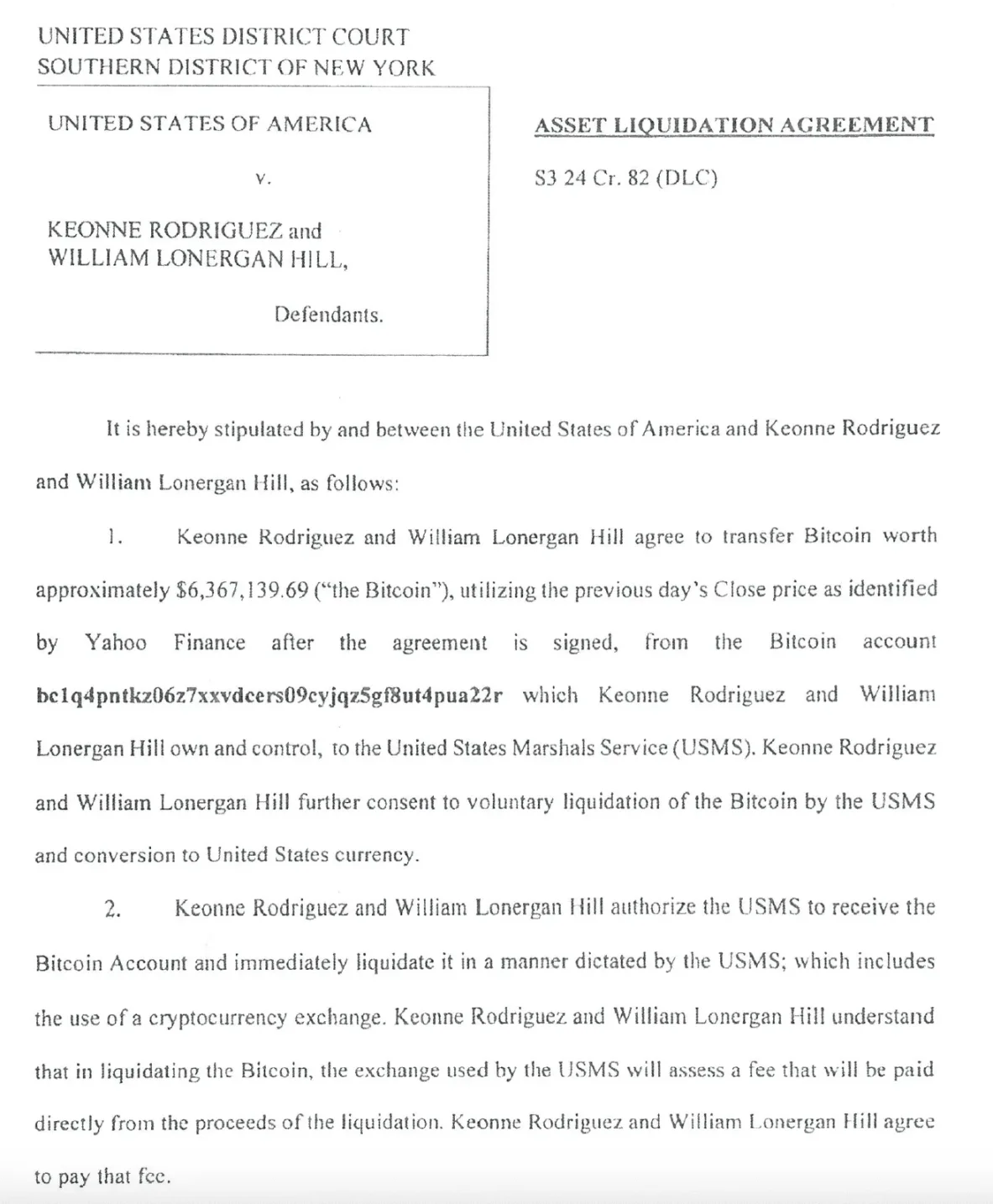 『ビットコイン・マガジン』は、これまで公開されていなかった「資産売却合意書」の文書を入手した。文書によると、RodriguezとHillが没収されたビットコインは、売却される予定であるか、すでに売却が完了している。