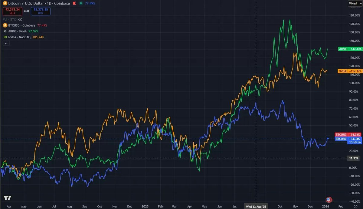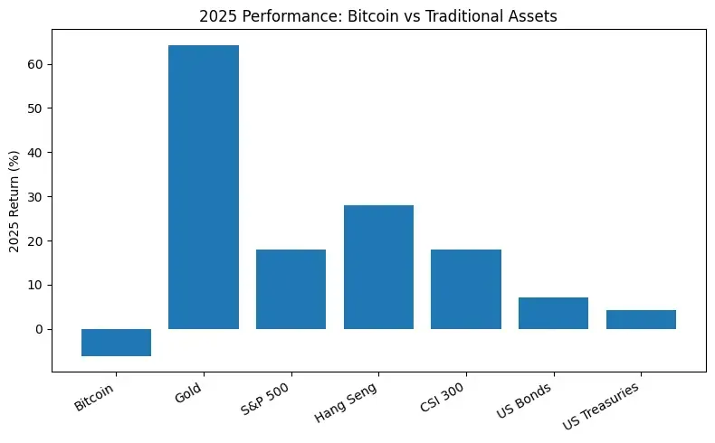 マルチアセットの観点から見ると、政策面での支援や制度的メリットがあるにもかかわらず、BTCは2025年にゴールド、米国株、香港株、A株など主要なTradFi資産に対して明らかにパフォーマンスを下回っており、グローバルリスク資産の中で新高値を同時達成できなかった数少ない資産の一つとなっている。