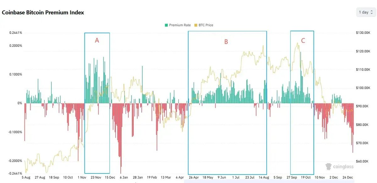 現物:オンショアが主な買手であり、オフショアはむしろ高値圏で利確に回っている。A/B/Cの各ピーク期間においてCoinbaseプレミアムは常に正の価格差を維持しており、これは高値圏での買い需要がCoinbaseを中心とするオンショアの現物資金によるものであることを示している。