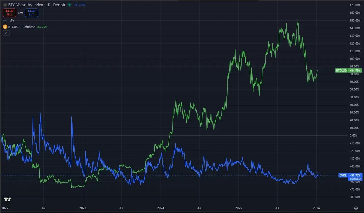 - 先物:オフショアはレバレッジ取引が活発だが、オンショア機関は継続的にポジションを縮小。BTC建てのオフショアOI(例:バイナンスBTC OI)はB、C段階で継続的に上昇し、レバレッジ率も上昇。10・10のレバレッジ解消後の一時的な低下後もすぐに高水準に戻り、新高値すら更新している。一方、CMEなどのオンショア先物OIは2025年初頭以降継続的に低下しており、価格が新高値を更新しても同期的に回復していない。また、BTCのボラティリティと価格は乖離しており、特に2025年8月にBTCが12万ドルを初めて突破した際、Deribit DVOLはむしろ低位にあり、新高値に対するインプライドボラティリティのプレミアムが付いていない。これはオプション市場がトレンドの持続性に対して慎重な評価をしていることを意味する。