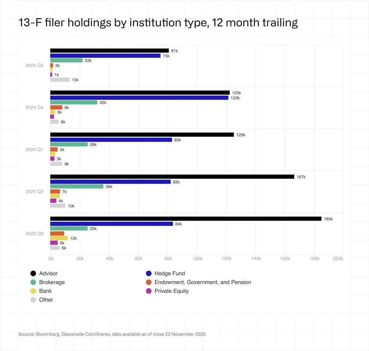 - 機関の中でも、主に財務アドバイザー(Advisors:ラップ口座やRIAを含む)とヘッジファンドに分かれる。アドバイザーは中期的なアセットアロケーションを目的とし、積立的・平滑な買い増しを行う(受動的資金);一方、ヘッジファンドは価格感受性が高く、アービトラージや中高頻度取引を志向しており、2024年Q4以降は全体的にポジションを縮小しており、CMEのOI低下傾向と高度に一致している(能動的資金)。