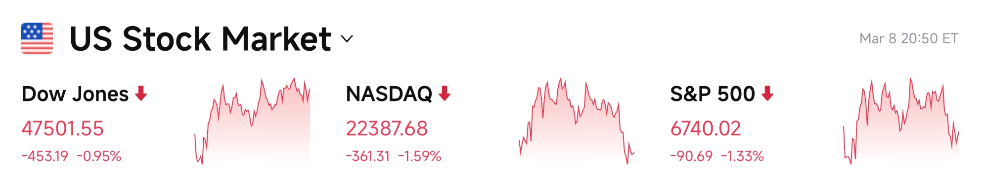 - ダウ工業株30種平均:0.95%下落し、47,501.55で終了。スタグフレーション懸念により継続的に圧力を受ける。