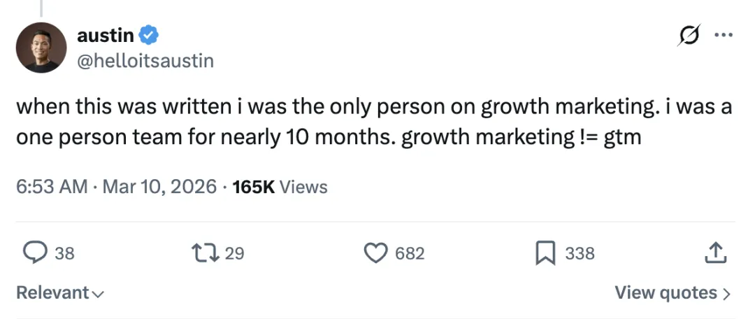 Austin Lau氏はLinkedIn上で最近、追加の背景情報を公開しています。彼によれば、広く拡散された記事が描写しているのは、2025年第2四半期の、自分が唯一の成長マーケティング担当者であった時期の話であり、その時点からすでに約8か月が経過しています。その後、チームは確かに人員を増強しましたが、その規模は外部の想像よりはるかに小規模であり、彼の表現を借りれば、「私たちの戦闘力は、人数以上に大きい」のです。
