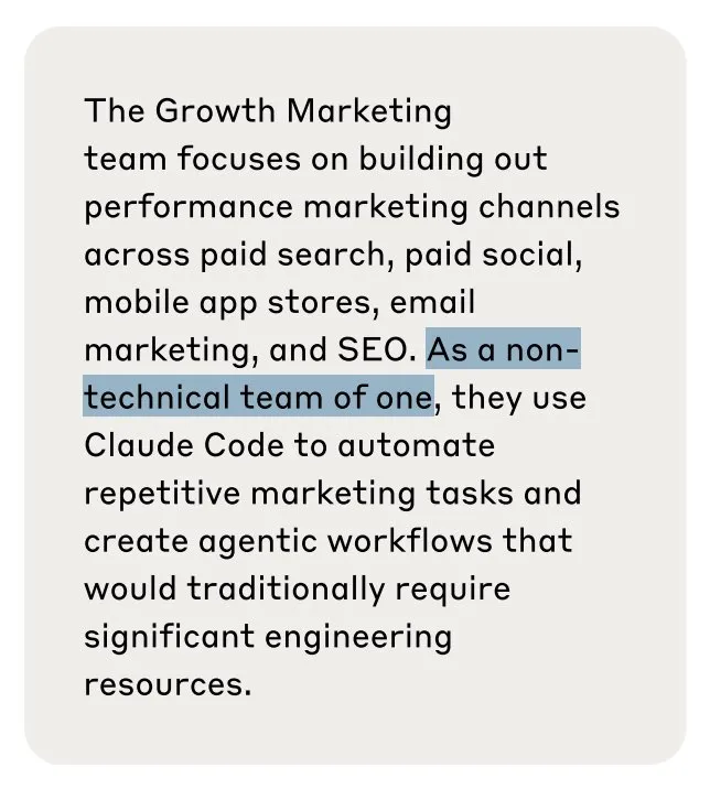 ホワイトペーパーには次のように記載されています。「成長マーケティングチームは、有料検索広告、有料ソーシャル広告、モバイルアプリストア、メールマーケティング、SEOなどのチャネルに焦点を当てており、『非技術系の1人チーム』である。Claude Codeを活用して反復的なマーケティングタスクを自動化し、従来なら多大なエンジニアリングリソースを要していた自動化ワークフローを構築している。」