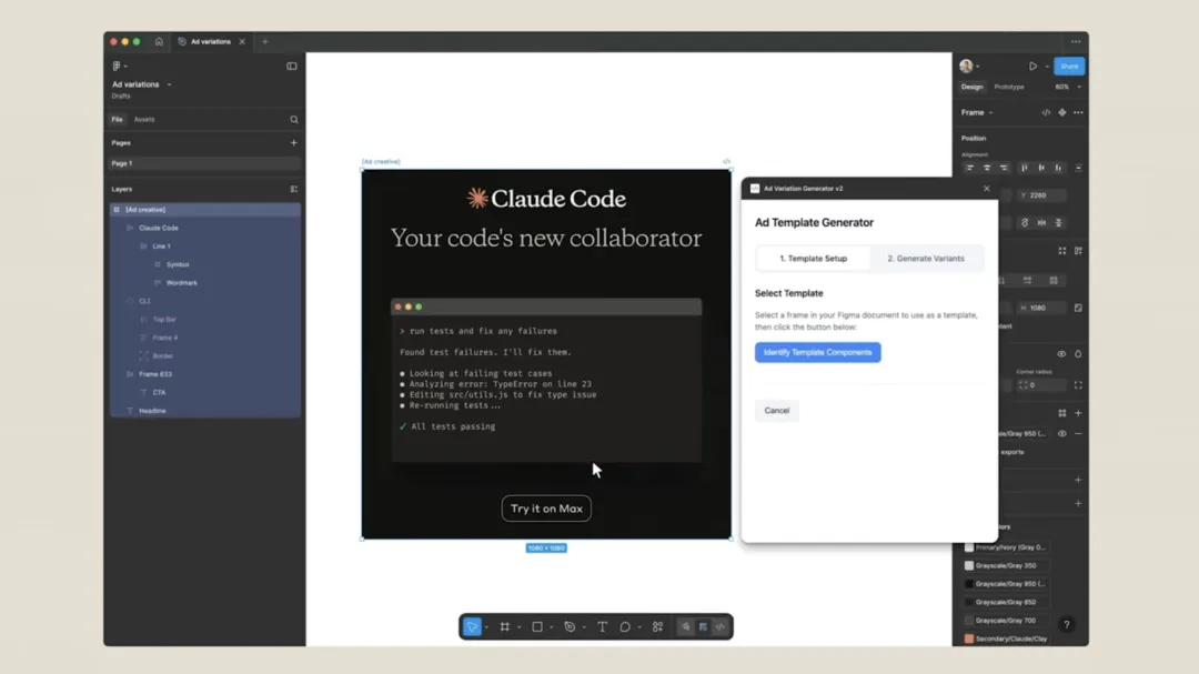 このプラグインの動作は以下の通りです:静止画像のフレームを選択すると、プラグインが自動的にその中のタイトル、CTAボタン、コードブロックなどのコンポーネントを認識します。そして、あらかじめ準備された文案リストから一括で独立したFigmaフレームを生成し、各バリエーションにそれぞれ新しい文案を割り当てます。1回のバッチ処理で最大100個の広告バリエーションを生成でき、処理時間はおよそ0.5秒。かつて30分かかっていた作業が、今ではわずか30秒で完了します。