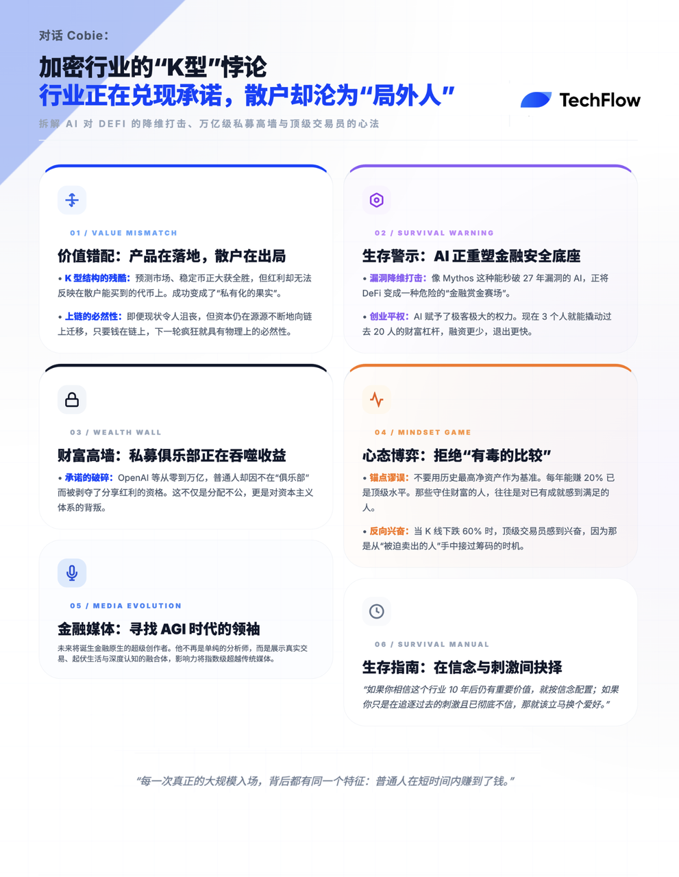 本回では、Cobie と threadguy が、Cobie の最近の Coinbase での仕事から話を始め、DeFi、AI、Bitcoin、Meme、トークン化株式、プライベート市場、および金融メディアの将来へと話題を広げていきます。Cobie の核心的な見解は、暗号資産業界において「K字型分極」が進行中であるという点です。すなわち、ステーブルコイン、予測市場、チェーン上取引インフラなど特定の分野では現実世界で着実な進展が見られる一方で、一般投資家はこうした成果を公開トークンを通じて容易に捉えることが難しい状況にある、というものです。また、AI は起業や市場参入の方法を激変させ、富の不平等をさらに拡大させる可能性があるものの、エアドロップ、チェーン上所有権、オープン金融といった暗号資産業界固有の仕組みによって、一部の価値再分配が依然として可能であるとも指摘しています。業界の低調期に身を置く人々に対して、Cobie は率直なアドバイスを提示します。「もし本当に未来に重要になると思うものがあるなら、自分の判断に基づいてポートフォリオを構築しなさい。逆に、もはや何にも信じていないのに、過去の刺激を追いかけてただ漫然とやっているだけなら、趣味を変えるべきだ。」