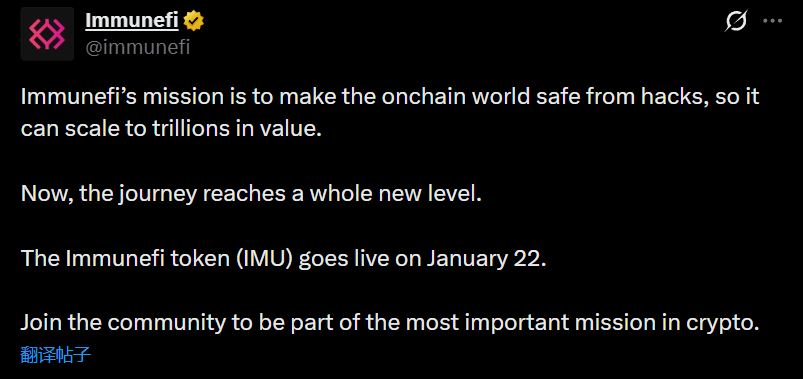 公式発表によると、暗号資産の脆弱性報奨金プラットフォームImmunefiは1月22日にプラットフォームトークンIMUを正式にリリースする予定です。
