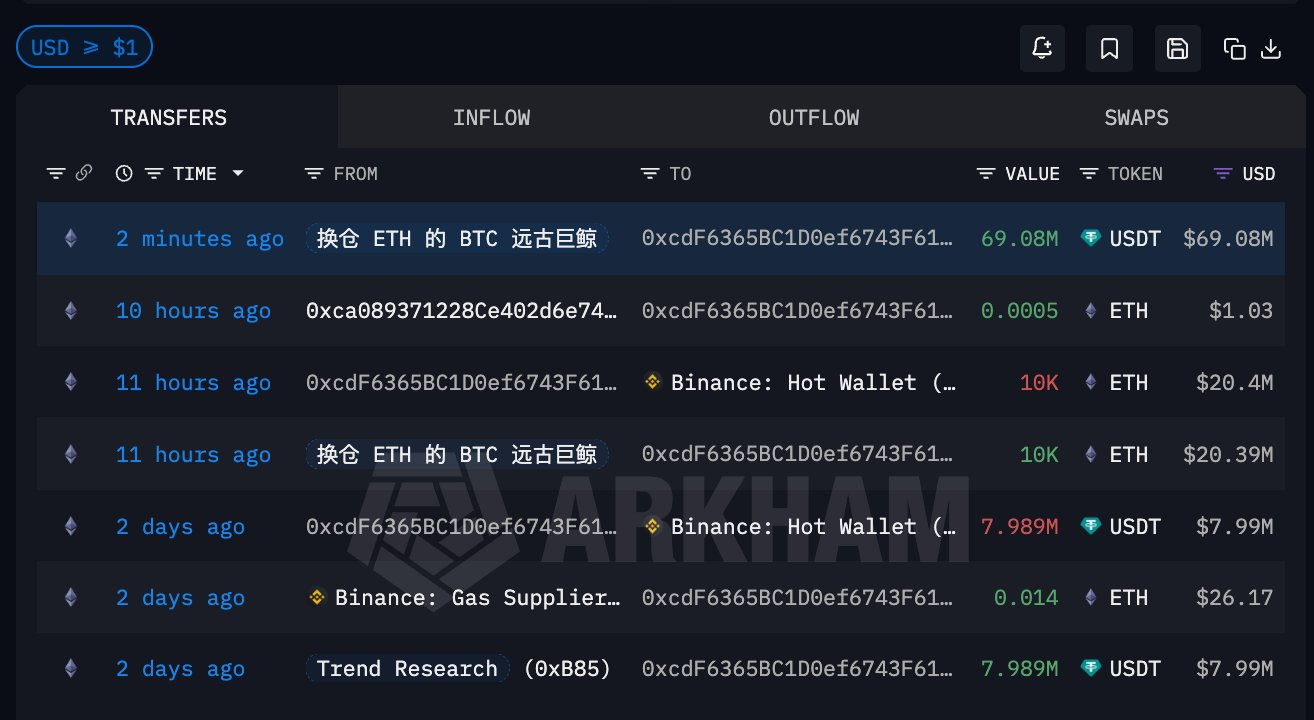 過去11時間以内に、この巨鯨は合計で1万枚のETHおよび6908万枚のUSDTを送金しており、その総額は約8947万米ドルに相当する。