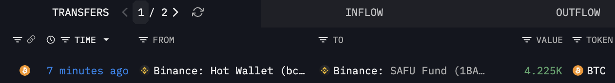チェーン上データによると、バイナンのSAFU基金アドレスが再び4,225 BTC(約3億米ドル相当)を購入しました。
